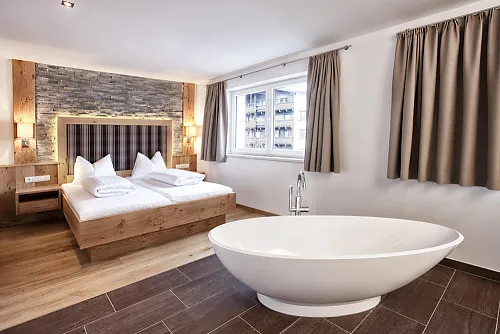 Our Tower Suite, a highlight in the hotel Heigenhauser! Enjoy a touch of luxury with a freestanding bathtub and the view to our beautiful mountains, open shower, separate toilet, hair dryer, make-up mirror, 2 flat screen TV’s with Radio program and a large balcony.